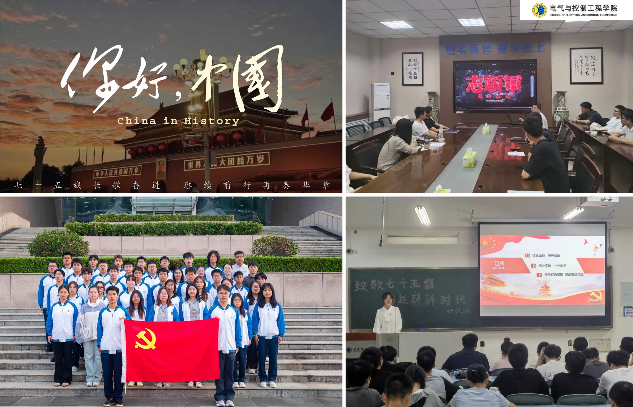 七十五载风华正茂,弦歌不辍献礼祖国。为热烈庆祝中华人民共和国成立75周年,深入学习贯彻党的二十届三中全会精神,弘扬爱国主义精神、传承红色基因,电控学院开展“铸初心·强精神·健体魄”庆祝中华人民共和国成立75周年系列主题活动。