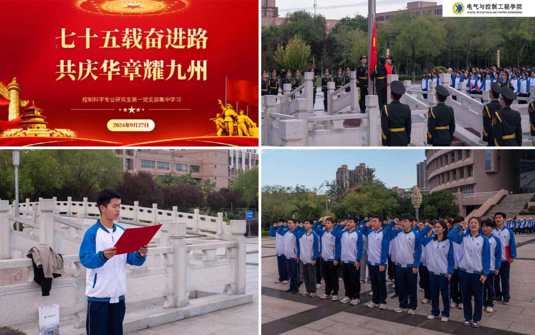 10月1日清晨,学院举行“七十五载长歌奋进,赓续前行再奏华章”系列党日活动,党员代表发表题为“盛世华诞,党旗飘扬”国旗下的演讲,在国旗下抒发对祖国的热爱之情。随后,全体党员紧握右拳,庄严宣誓,表达了大家为共产主义事业奋斗终生的决心和信心。学院各师生党支部集中学习贯彻全国教育大会精神,领悟习近平总书记重要讲话精神实质和核心要义。控制科学专业研究生第一党支部开展“七十五载奋进路,共庆华章耀九州”党课学习,使每位同志在学习中感悟民主法治的不断完善、经济建设的飞速进步、社会文化的繁荣发展。