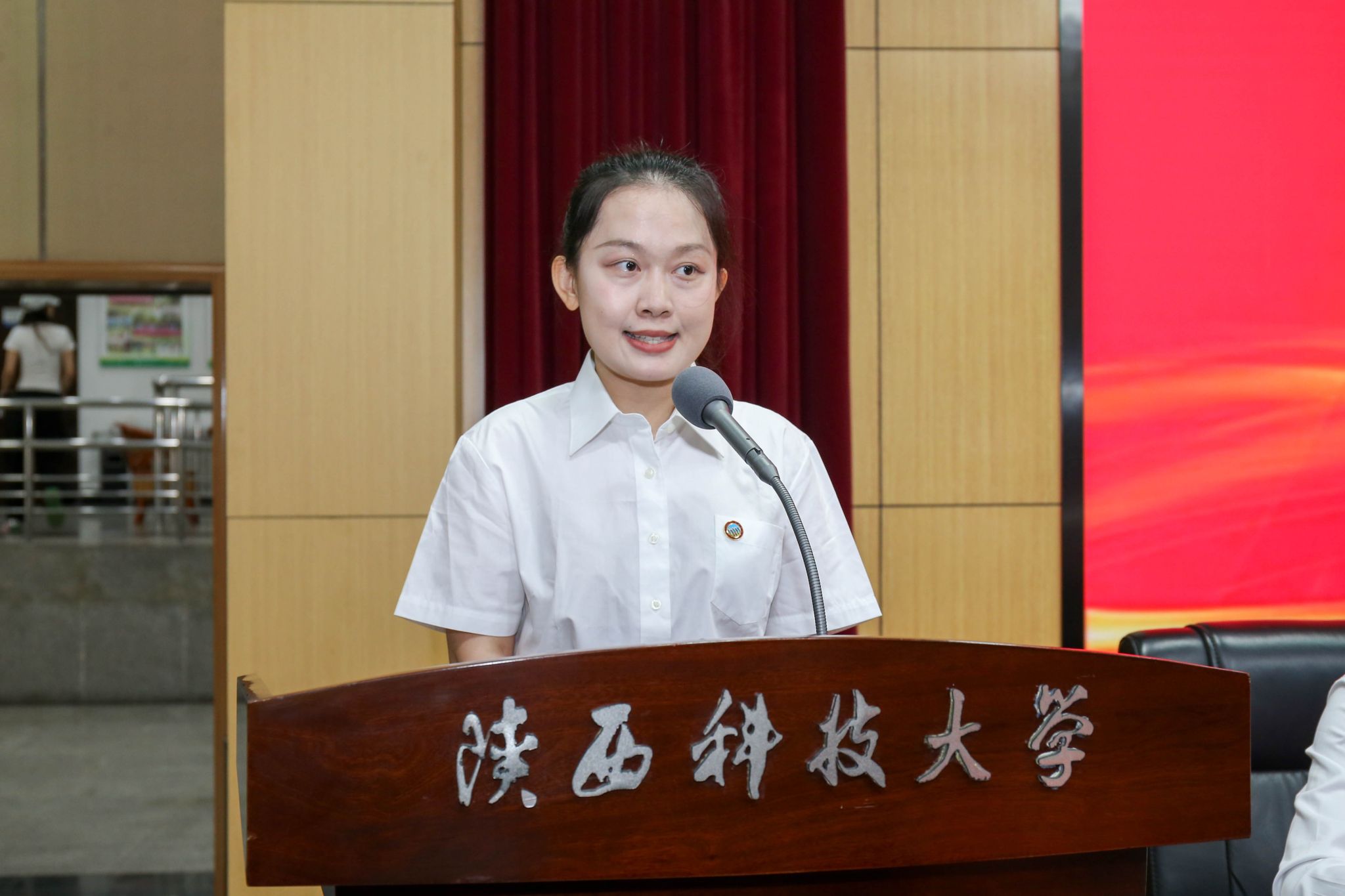 新进教师代表为从教满三十年教师代表送上鲜花祝福,从教满三十年教师代表为新进教师代表佩戴校徽,寓意两代教师将陕科大精神,将立德树人、教书育人的荣誉和使命薪火相传。