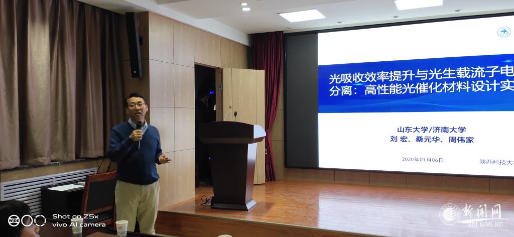1月6日下午,应金沙官网科技处、前沿院及轻工科学与工程学院邀请,山东大学晶体材料国家重点实验室、济南大学前沿交叉科学研究院刘宏教授做客金沙官网“前沿科学报告”,并做了题为“光吸收效率提升与光生载流子分离:高性能光催化材料设计策略”的前沿科学报告。轻工学院相关专业教师、研究生参加了此次报告会,轻工学院副院长吕斌教授主持了本次报告会。