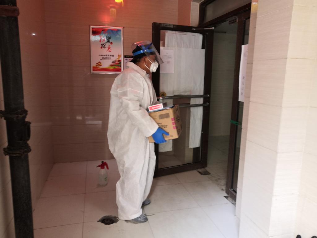 第一个让他感动的是贾佰平师傅。疫情防控一开始,贾师傅一肩扛下了隔离区保洁、通勤管理的全部工作,成为隔离区143户311名教职工及家属身边“最亲近的人”。他每天早上7点上班,先密封处理完整楼住户的垃圾,再仔细地为所有楼道打扫卫生、消毒杀菌。热心的贾师傅还义务充当了大家的“黄马甲”“快递员”,送到隔离区外的快递、蔬菜水果等生活用品,全部由他送上门,几趟跑下来,防护服里面就是一身汗。张建军说,“贾师傅身处隔离区,每天上下奔忙,从没抱怨过。”