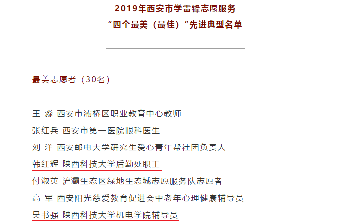 近日,中共西安市委宣传部、中共西安市委文明办等14部门联合下发通知,公布2019年西安市学雷锋志愿服务“四个最美(最佳)”先进典型名单。其中金沙官网机电工程学院辅导员吴书强、后勤集团饮食服务中心职工韩红辉被授予2019年西安市学雷锋志愿服务“最美志愿者”称号。