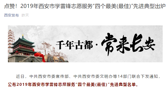 《通知》指出,2019年西安市各区县、开发区和各行业部门深入贯彻落实习近平新时代中国特色社会主义思想和党的十九大、十九届二中、三中、四中全会精神,认真贯彻落实习近平总书记关于学雷锋志愿服务工作的重要指示要求,积极培育和践行社会主义核心价值观,大力弘扬奉献、友爱、互助、进步的志愿精神,持续推动我市志愿服务事业蓬勃发展,涌现出一批事迹突出、群众公认、影响广泛的先进典型,对推动我市社会文明进步发挥了积极作用。