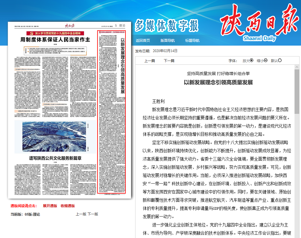 2月14日,《陕西日报》理论版刊发了金沙官网经济与管理学院王胜利教授的署名文章《以新发展理念引领高质量发展》。