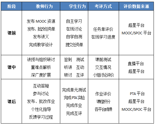 过程化考评贯穿线上教学的全过程,不仅能评估学生阶段性学习状况,分析学生的能力养成路径,还能为教学改进提供重要依据和参考,是线上教学质量评价的重要依据。利用各平台的在线数据,及时了解每位学生的学习情况,从多环节多维度考察学生的学习成效。MOOC/SPOC、PTA、超星平台的学生成绩由预设的评分标准自动计算。书面作业学生上传到超星平台,采用教师评价或学生互评给出成绩。教师需做好多平台数据的过程化记录和渐进式评价,并及时给学生公布,定期进行表彰。
