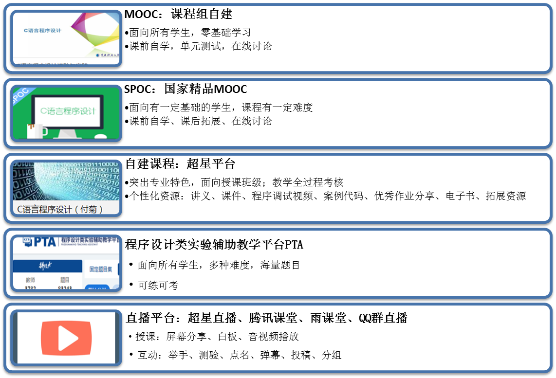 课程资源过于丰富,会导致学生信息迷航和信息过载,线上教学中学生需要清晰的学习路径,精准的教学实施方案是满足学习引导需求的保障。课程组所有老师报名学习了教务处组织的线上教学培训课程和各类讲座,经过多次实践和讨论,明确课程授课计划和考核标准,形成快速入门、逐步深入、分散难点、应用驱动的课程教学思路,确立“MOOC+SPOC+自建课程+PTA+直播”五位一体的教学模式,每位老师准备了3种直播方案。经过6周的线上教学后,课程组召开了线上教学经验交流会,邀请教学院长、学院督导和学院教秘参加会议,老师们分享教学经验,总结不足,调整课程实施方案,确保线上教学质量。
