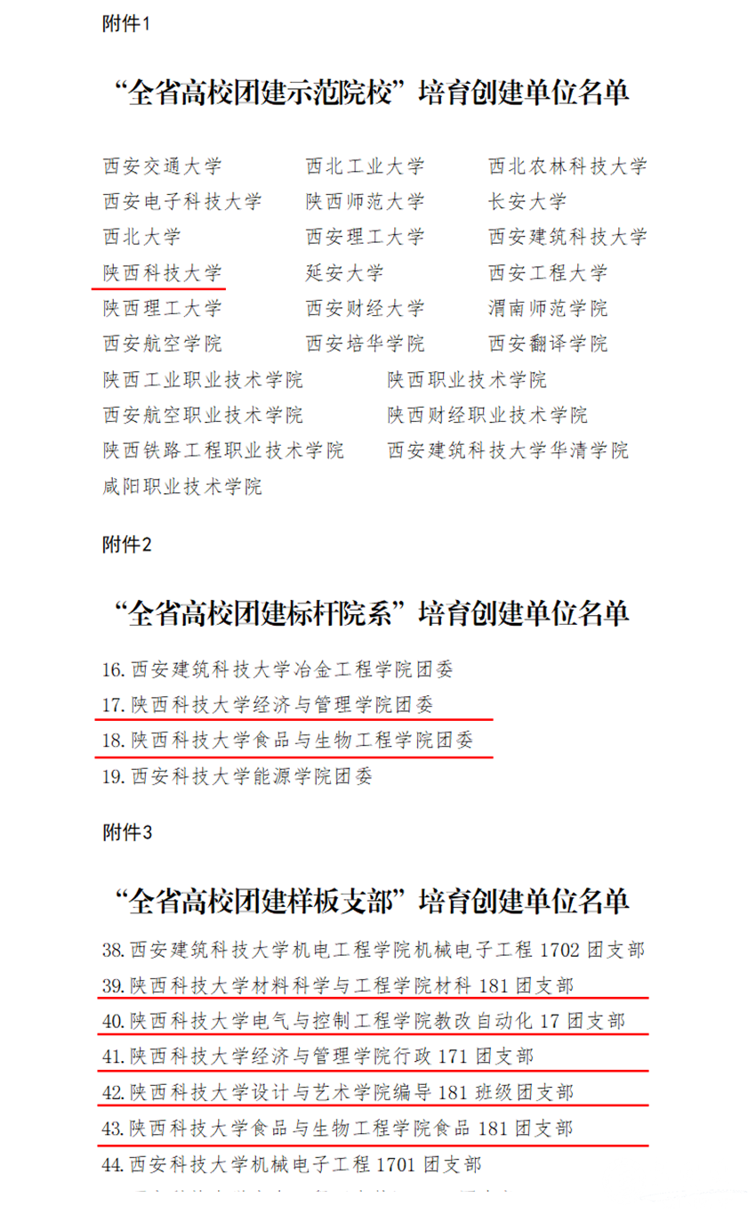 近日,共青团陕西省委办公室、中共陕西省委教育工委办公室公布第一批全省高校团建示范院校、标杆院系、样板支部培育创建名单,js3845金沙线路入选“全省高校团建示范院校”培育创建单位;经济与管理学院团委、食品与生物工程学院团委入选“全省高校团建标杆院系”培育创建单位;材料科学与工程学院材科181团支部、电气与控制工程学院教改自动化17团支部、经济与管理学院行政171团支部、设计与艺术学院编导181团支部、食品与生物工程学院食品181团支部入选“全省高校团建样板支部”培育创建单位。