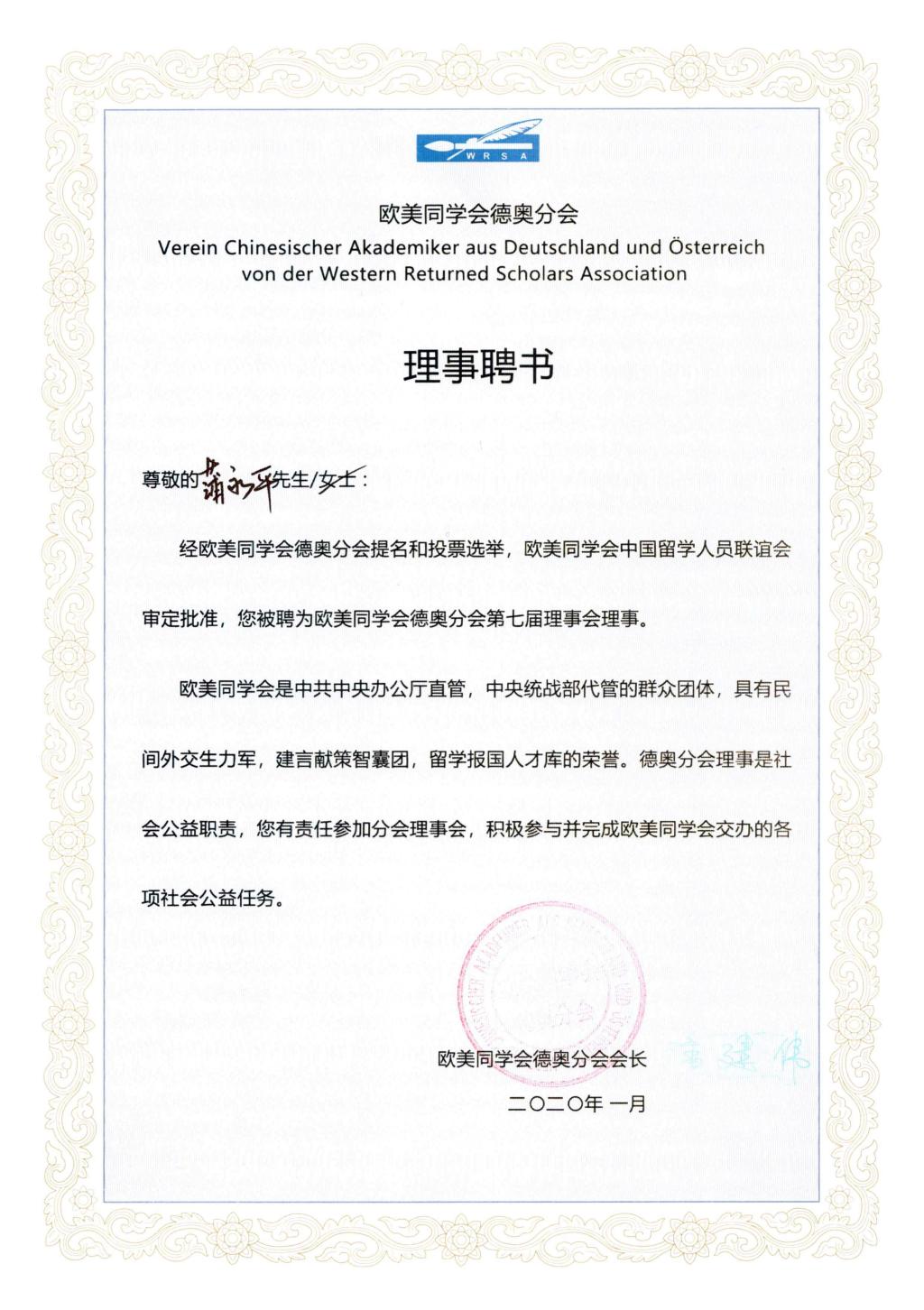经陕西省委统战部组织推荐、欧美同学会德奥分会提名和投票选举,欧美同学会(中国留学人员联谊会)审定批准,陕西省欧美同学会常务理事、金沙官网材料科学与工程学院蒲永平教授获聘欧美同学会德奥分会第七届理事会理事。