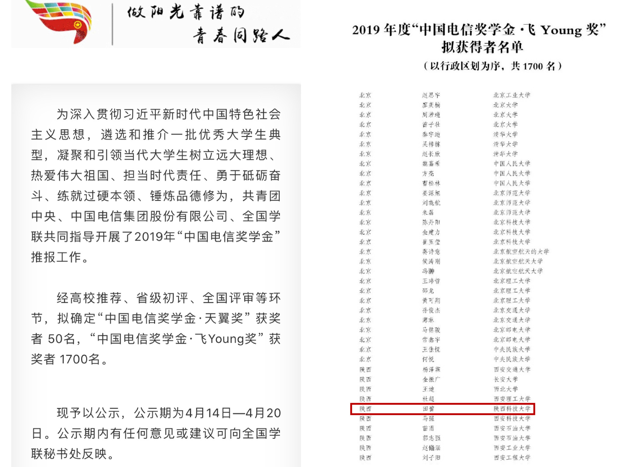 附:2019年度“中国电信奖学金”获得者名单:http://zqb.cyol.com/html/2020-05/29/nw.D110000zgqnb_20200529_1-07.htm