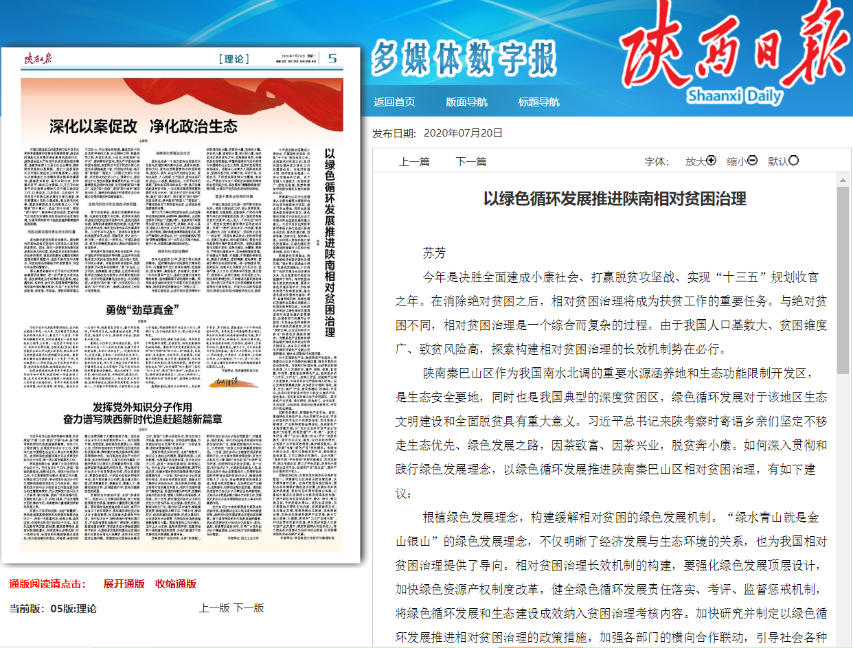 7月20日,《陕西日报》理论版刊发了金沙官网经济与管理学院苏芳教授的署名文章《以绿色循环发展推进陕南相对贫困治理》。