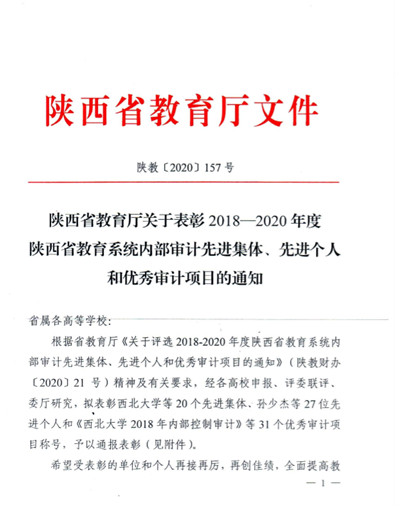 近日,陕西省教育厅对全省2018-2020年度教育系统内部审计先进集体、先进个人和优秀审计项目进行了表彰,金沙官网荣获2018-2020年度陕西省教育系统内部审计先进集体、蔡儆同志荣获内审先进工作者、两项审计项目获评优秀审计项目。