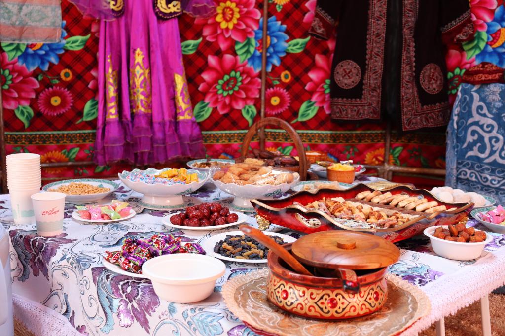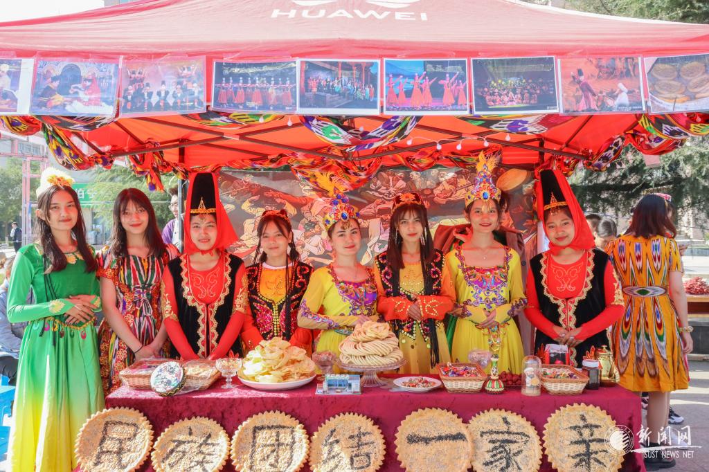 午间,在沁园广场举行民俗风情展,午场的节目有傣族舞蹈《版纳印象》、藏族歌曲《康定情歌》、苗族舞蹈节目《一抹红》以及《民族团结一家亲》等,各族同学身着节日盛装,尽情演绎独具魅力的民族歌舞;在民族展示区内,各民族同学向大家介绍本民族的风俗习惯以及特色美食,展区内有维吾尔族的烤全羊、手抓饭、烤羊肉、馕,藏族的风干牦牛肉、奶渣子,蒙古族的马奶酒等;还有投壶、射箭、抓羊拐、看名猜物、翻花绳、抽陀螺等民族趣味游戏,吸引了众多同学参与其中。