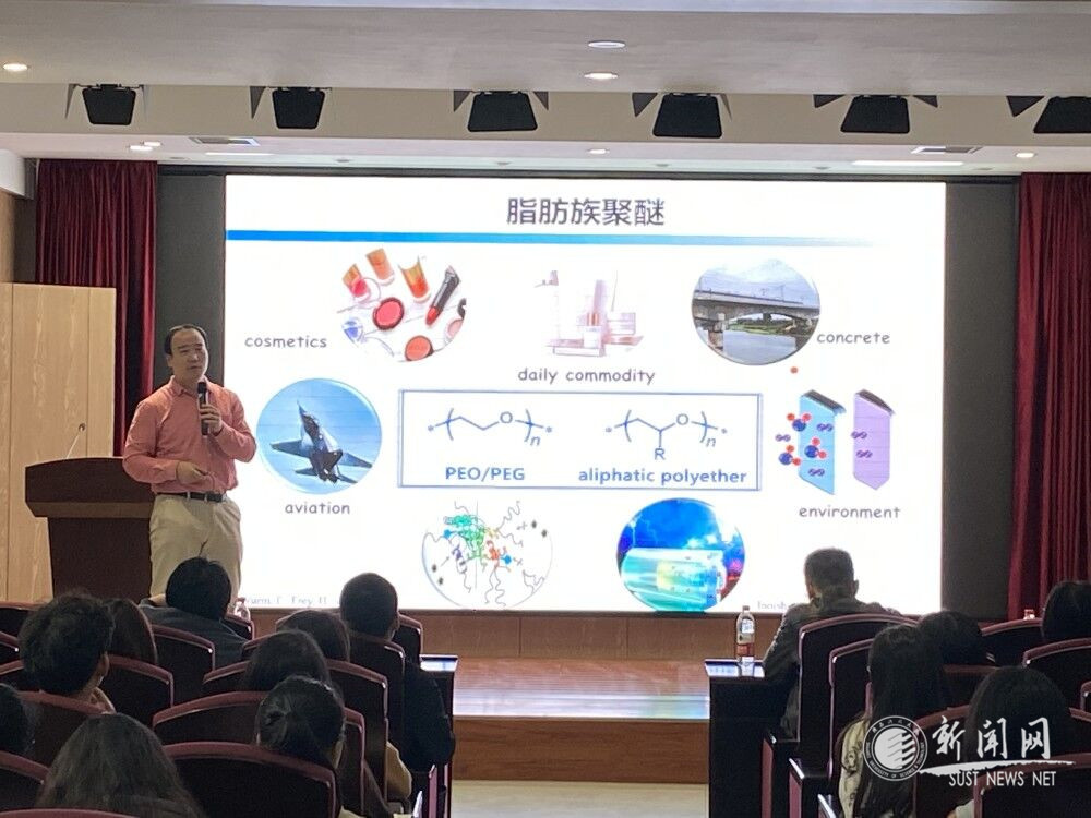 赵俊鹏教授详细介绍了脂肪族聚醚/聚酯在有机小分子催化环氧单体/环酯单体开环聚合制备高附加值聚醚/聚酯方面的主要工作,包括基于单组分有机碱催化的环氧乙烷均聚、环氧/环酯单体的嵌段共聚、环氧/酸酐单体的交替共聚。以及基于双组分有机Lewis酸碱对催化的环氧/环酯单体串联共聚,环氧/环状酸酐的序列选择性共聚等工作。赵教授的学术报告展现了其对环氧化合物参与的高效聚合反应的独特见解,对金沙官网师生在该领域及相关领域今后研究方向的深入与拓展具有很好的启发性。报告结束后,他还与在座师生就报告内容进行了深入的讨论和交流。
