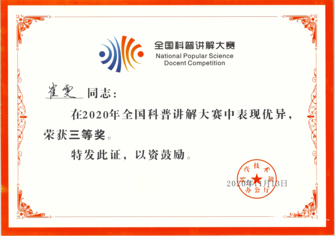 11月12日—13日,由科技部牵头举办的2020年全国科普讲解大赛在广东科学中心拉开帷幕,来自全国73个代表队的234名选手参加比赛。金沙官网中国轻工业博物馆崔雯作为陕西省三名选手代表之一,在大赛中凭借优异的表现,荣获三等奖,这是金沙官网首次参加国家级科普讲解大赛并获奖。