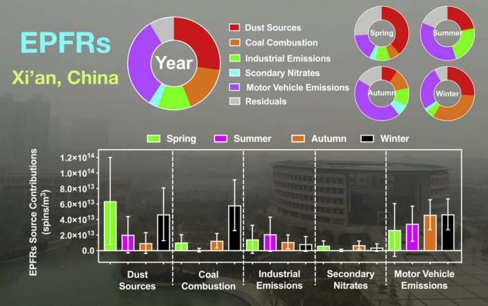 “Source apportionment of environmentally persistent free radicals (EPFRs) in PM2.5over Xi'an, China (西安市PM2.5中环境持久性自由基EPFR的来源分配)”基于化学分析和正定矩阵因子分析(PMF)报道了PM2.5中EPFR的来源。本团队于2017年4月至12月在西安市收集每日PM2.5样本,并对EPFR和其他化学成分进行定量分析。揭示了EPFR的五个主要来源:扬尘源、燃煤源、二次硝酸盐、工业排放源和机动车排放源。燃煤源、机动车排放源和扬尘源是EPFR的三大贡献者(占76%)。燃煤对PM2.5和EPFR至关重要。春季,由于沙尘暴气象事件的发生,扬尘源对EPFR的贡献很大。将PMF结果与气象数据相结合后发现,西安市中心排放的大气污染物可以通过南风运到采样地点。这些结果表明需要对EPFRs的公共健康影响进行进一步研究,并可用于帮助制定污染物源头控制措施,以减少EPFRs在PM2.5中带来的潜在健康风险。全文链接:https://doi.org/10.1016/j.scitotenv.2019.06.424