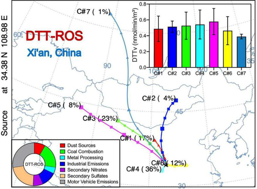 “Study on the oxidation potential of the water-soluble components of ambient PM2.5over Xi'an, China: Pollution levels, source apportionment and transport pathways (西安市环境PM2.5水溶性组分的氧化潜能研究:污染水平,污染源分配和运输途径)”以被认为是对人体造成不利影响的大气颗粒物中的活性氧(ROS)为背景,采用DTT方法测量了2017年在西安市采集的116个日细颗粒物样品中的ROS水平,并对大气颗粒物中ROS的来源进行定量分析。结果表明,西安市ROS产生水平最高水平发生在冬季,其次是春季,夏季和秋季。PMF的源解析结果显示,PM2.5中ROS主要贡献源来自机动车排放物、二次硫酸盐和燃煤源。后向轨迹聚类分析表明,主要的聚类群是本地和区域运输,而西安上空PM2.5的氧化潜能受远程运输的影响大于受本地运输的影响。如上所述,提高大气氧化潜力不仅需要区域性努力,还需要大规模的联合合作。此外,这项关于大气颗粒物的氧化潜能的研究以及具体的来源信息为健康效应研究提供了重要的指导。全文链接:https://doi.org/10.1016/j.envint.2020.105515