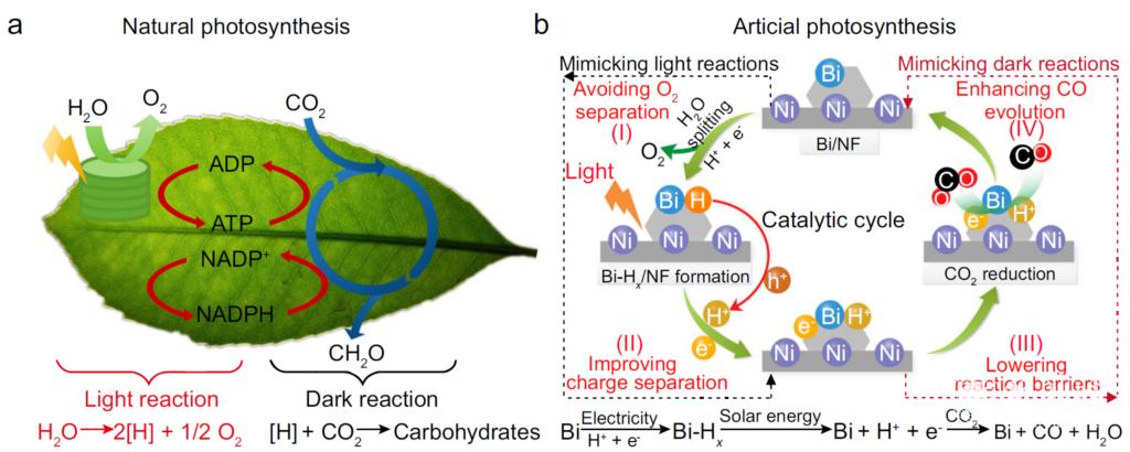 本研究工作得到了国家自然科学基金(21972082和21673220)和陕西省高校青年创新团队等项目的资助。在该研究中首先用电化学方法将H2O分解为H原子和O2(实现植物光合作用中光反应的模拟),生成的活性H储存在Bi纳米粒子中形成Bi-Hx。在光照条件下,Bi-Hx可以作为一种强的还原剂,通过电子-质子协同转移机制将CO2还原为CO,同时Bi-Hx恢复为Bi(实现植物光合作用中暗反应的模拟),完成了一次完整的模拟光合作用循环反应。在这一过程中,Bi作为电子-质子转移介质,在时间和空间上实现了水分解和CO2还原的分离。该反应为人工光合作用催化剂的设计提供了一个新模型,具有以下三个特点:(1)避免了水作为直接还原剂参与到CO2还原过程,提高了产物选择性;(2)避免了生成产物中O2的分离,以及生成O2对还原产物的氧化;(3)降低了反应活化能,提高了催化剂活性(达到了283.8μmol/h/g)。此外,鉴于目前光催化剂主要为半导体材料,而等离子体光催化剂的报道非常少,其中非贵金属等离子体催化剂的研究更少,因此,该研究为设计与开发廉价、高效CO2还原催化材料提供了新借鉴。