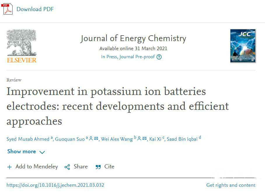 近日,金沙官网材料科学与工程专业国际硕士研究生Syed Musab Ahmed(中文名:马高阳)以第一作者身份在国际TOP期刊Journal of Energy Chemistry(1区,IF=7.216) 在线发表了题为“Improvement in potassium ion batteries electrodes: recent developments and efficient approaches”的综述论文。该论文以js3845金沙线路为第一通讯单位,金沙官网材料学院微纳材料开发与功能创新团队锁国权副教授和北京航空航天大学王伟教授为共同通讯作者。该论文的发表标志着金沙官网在国际学生培养方面取得了新进展。