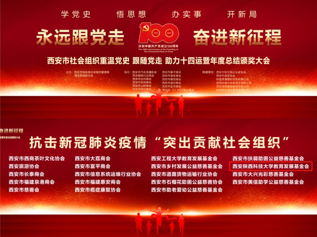 4月28日,西安市社会组织“重温党史 跟随党走 助力十四运暨年度总结颁奖大会”在西商国际花园酒店召开,全市近115家社会组织参会。金沙官网教育发展基金会被西安市民政局授予“抗击疫情突出贡献社会组织”荣誉称号。