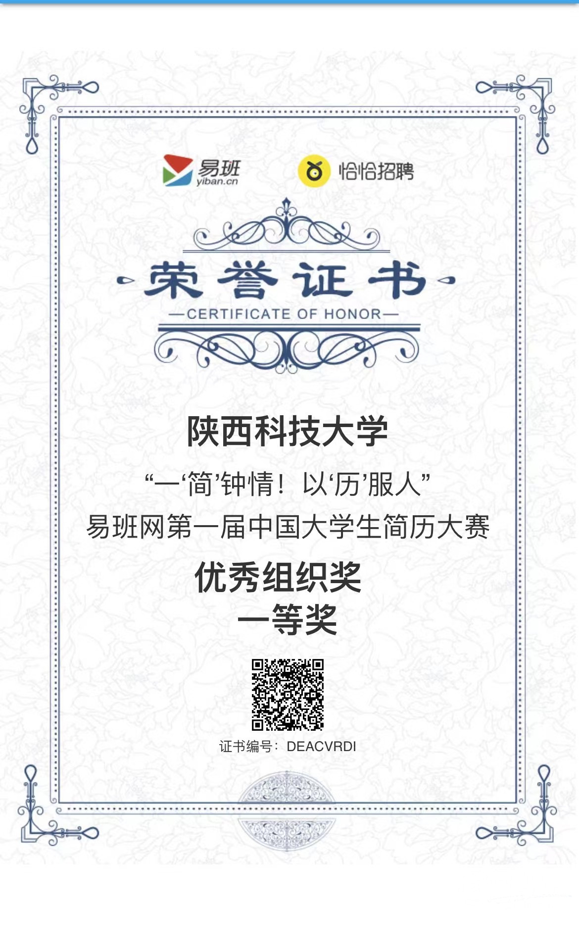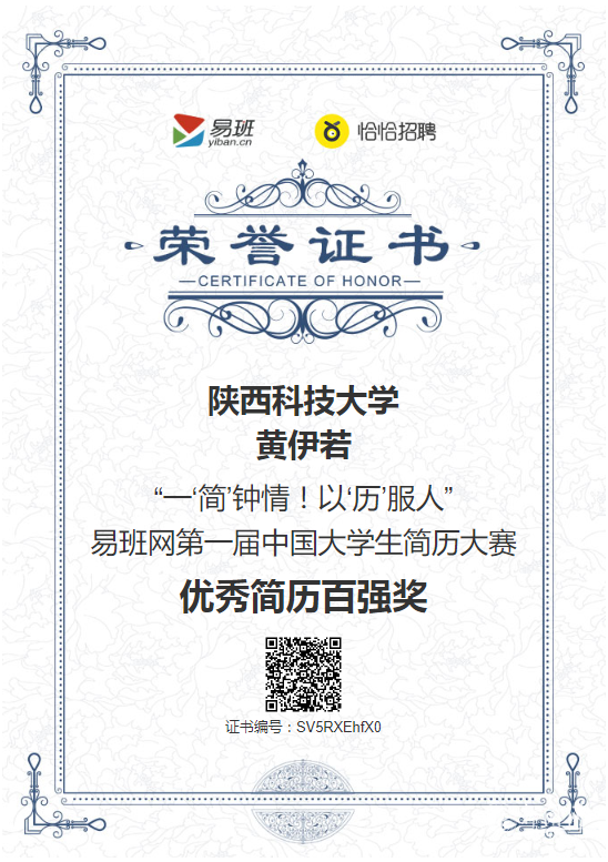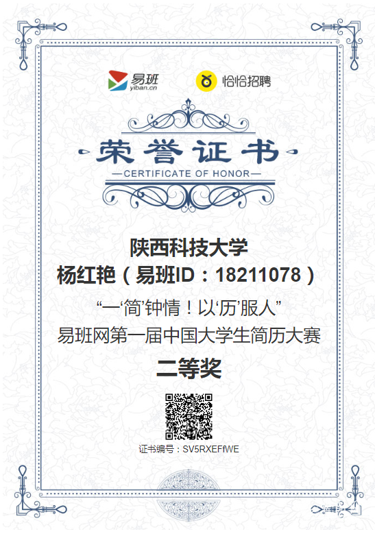 “一‘简’钟情!以‘历’服人”——易班网第一届中国大学生简历大赛落下帷幕,此次大赛由易班网恰恰招聘频道主办,覆盖全国24个省4个自治区,共有近400所高校、10000多名学生参与。参赛的简历数量超1.32万份,获得超过245.9万人次的助力支持。金沙官网材料科学与工程学院杨红艳在众多参赛选手中脱颖而出,获得全国二等奖(第二名)的优异成绩,环境科学与工程学院黄伊若获“优秀简历百强奖”,就业指导中心段引香、电子信息与人工智能学院刘贝民、经济与管理学院刘育涛荣获“优秀指导老师”称号,金沙官网成为全国唯一一所荣获三名优秀指导教师称号的高校。同时,金沙官网荣获“优秀组织奖一等奖”称号。