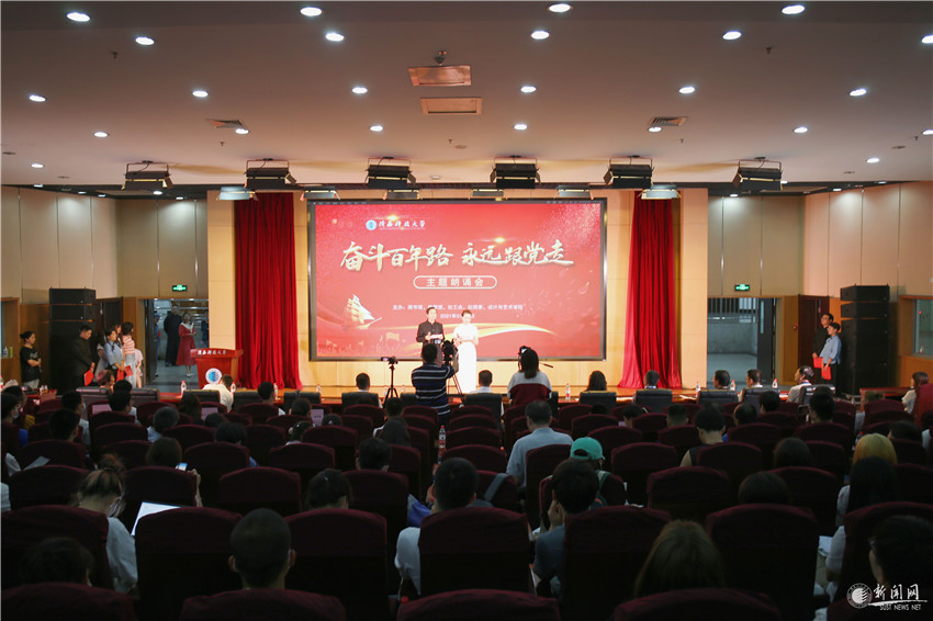 5月31日,由图书馆、档案馆、校工会、校团委、设计与艺术学院联合举办的“奋斗百年路 永远跟党走”主题朗诵会在图书馆学术报告厅举办,校党委副书记杨欲晓、王道安,校党委副书记、纪委书记、监察专员王为民,副校长李学军,总会计师徐晓峰出席了朗诵会。朗诵会由图书馆、档案馆策划,设计与艺术学院教师贺岭导演,师生共400余人参加了朗诵会。