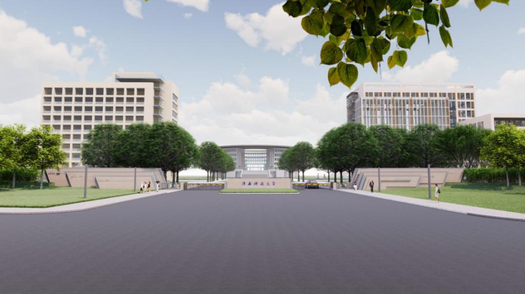 无门楼延展无界限。南大门坐落在学校中轴线上,东西长22米,东西两翼最高处为5.5米,秉承着开放的设计理念,采用了无门楼的设计,北望图书馆,南临元朔路,谓“其途之所出,四通而八达”,与碧波荡漾的科大湖、巍峨矗立的图书馆,共同绘就了学校全新的形象名片,成为展示学校的新窗口。