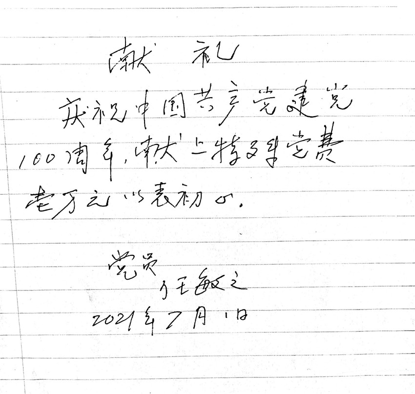 任敏之还随“特殊党费”向组织上交了一封亲笔信,信中写道,“庆祝中国共产党成立100周年,献上特殊党费壹万元以表初心。”