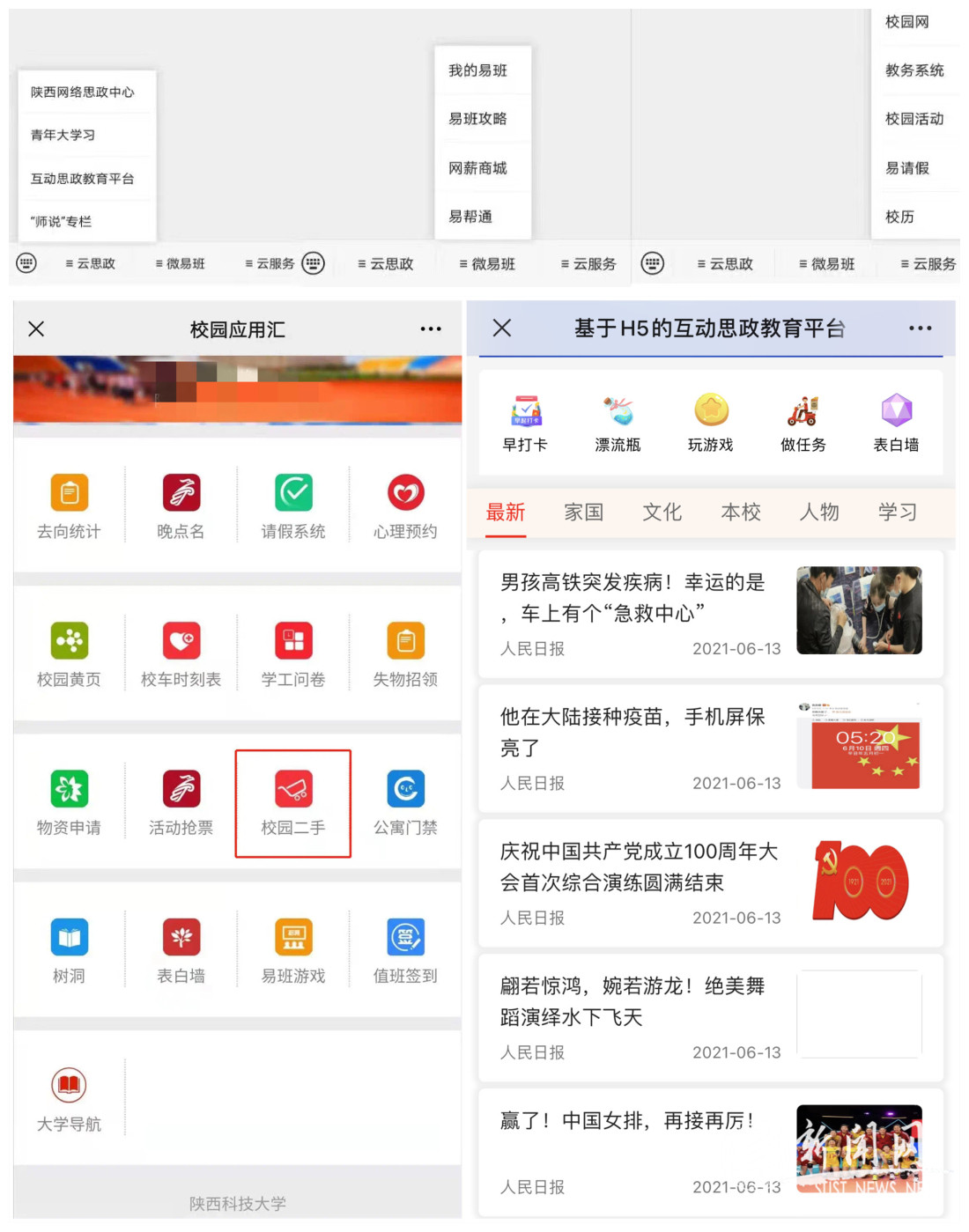 金沙官网于2015年正式开展易班建设工作,打造集“思想引领、教育教学、文化娱乐、生活服务”为一体的易班平台。截止目前,学校建立机构群43个,公共号296个,公共群1800个,注册用户50160人,校方认证46674人,陕科大“易班”手机客户端单日最高活跃指数达26289人次,学校机构号和公共号发布话题13887个。为进一步发挥网络平台对学生思想政治教育的积极作用,把握时代特点及网络规律,校网络思政中心基于微信公众号和易校园思政云平台,积极运用“云思政”理念,发挥“云思政”优势,着力构建“易班+微信”新模式,凸显“双平台”全方位育人功能,于6月17日正式上线“SUST云科大”服务号。