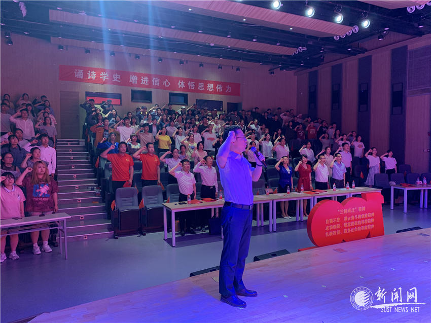 学院党委书记訾荣禄代表党委班子成员品读《沁园春·长沙》,充分解读毛泽东主席创作该诗词的历史背景,深情回顾建党初期的峥嵘岁月,深刻阐释习近平总书记引用该词赋予的新时代精神内涵,鼓励全体党员同志爱党爱国、胸怀大志、珍惜当下、奋发有为,并带领全体党委班子成员进行了朗诵,重温一代伟人的远大志向和浩然壮气。展演最后,訾荣禄带领学院党委委员和全体到场同志重温了入党誓词。