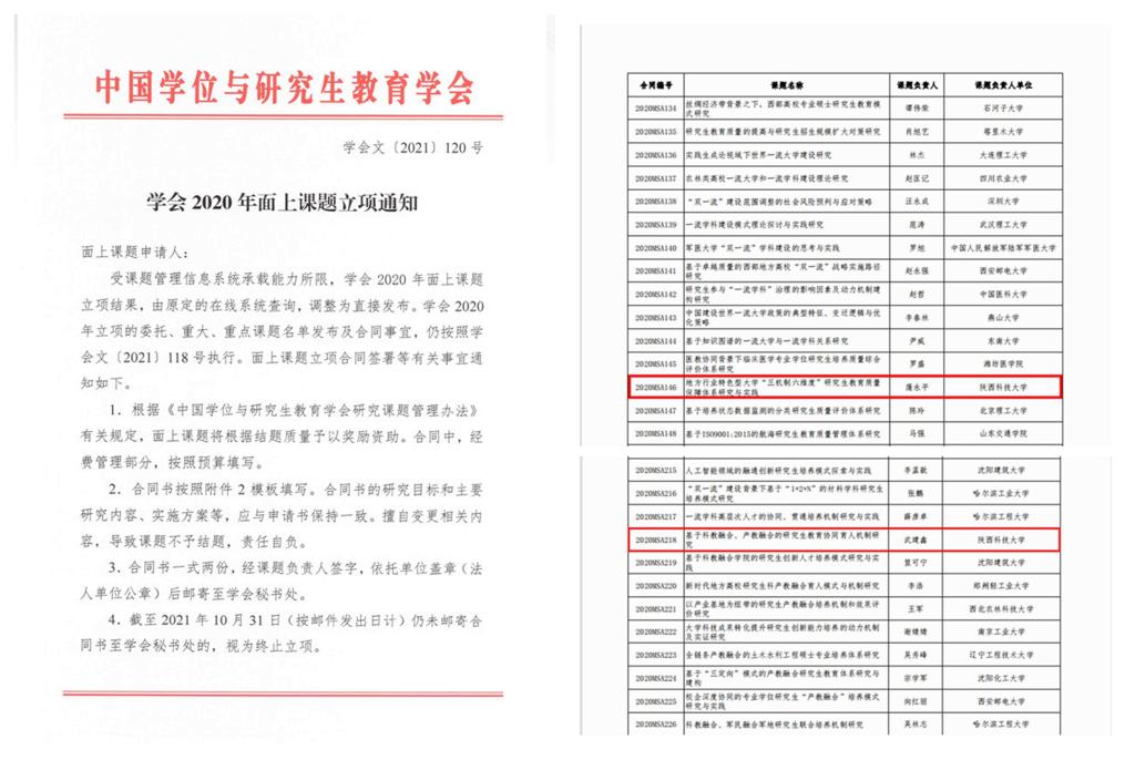 近日,中国学位与研究生教育学会公布了2020年面上课题立项结果,金沙官网材料科学与工程学院蒲永平教授申报的《地方行业特色型大学“三机制六维度”研究生教育质量保障体系研究与实践》、教育学院武建鑫副教授申报的《基于科教融合、产教融合的研究生教育协同育人机制研究》2个项目获批立项,这是金沙官网首次获得中国学位与研究生教育学会研究课题立项,立项数量在陕西省属高校中位列第三。