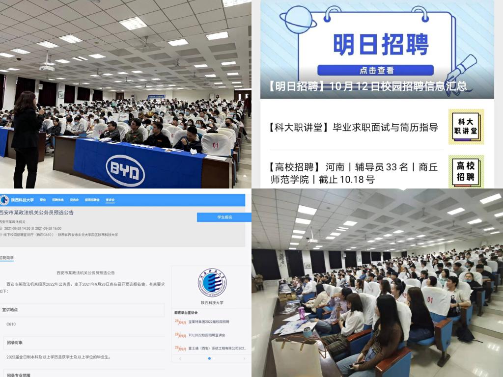 突出氛围营造,着力构建“宣传+帮扶”就业服务平台。加强就业资讯推送,通过“一网一平台”就业信息服务平台,推送包含名企校招、公务员招录,事业单位招考、高校招聘等推文300余篇,为学生提供高质量、多元化就业选择。打造“科大职讲堂”品牌就业指导活动,联合专业机构开展讲堂5次,为考研考公学生提供备考知识指导、备考资讯推送和备考技能提升。常态化开展线上线下招聘活动,自9月20日开放校园招聘以来,累计举办15场线上招聘会,220余场专场招聘会、地市组团招聘会,其中海康威视、京东方、舜宇集团、比亚迪等企业招聘现场异常火爆。积极关注就业困难群体,做好兜底保障,累计为399名家庭经济困难毕业生申请求职创业补贴。