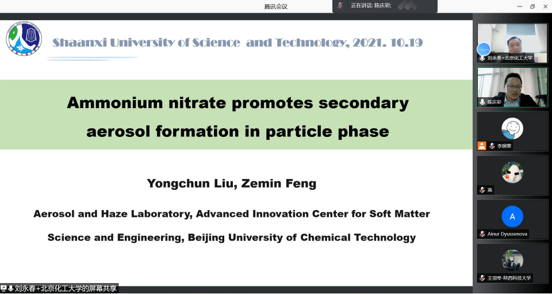 刘永春教授以“大气颗粒物中硝酸铵对二次气溶胶生成的影响研究”为题,介绍了大气颗粒物对区域空气质量、大气能见度、气候变化和人体健康的重要影响,阐明了二次颗粒物的生成机制是大气化学研究的前沿和热点,其中污染物在颗粒物相的非均相反应及其对二次颗粒物生成的影响更是目前大气化学的研究难点。刘教授还介绍了硝酸铵可通过吸湿改变颗粒物相态,进而显著促进气态二氧化硫向颗粒态的摄取并最终生成硫酸盐等研究发现,提出了在燃料深度脱硫和农业氨排放巨大的背景下,我国未来需加强氮氧化物和氨的减排的建议。