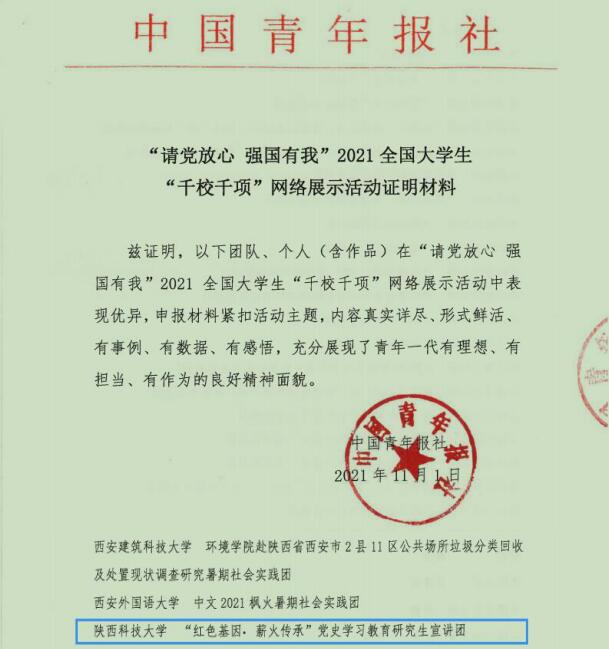 近日,由中国青年报·中青在线组织开展的“请党放心 强国有我”2021全国大学生“千校千项”网络展示活动,最终评选出1000份成果(含500份团队风采、300份个人事迹、200份青春影像)。在研工部、校团委的指导和支持下,马克思主义学院认真组织、精心策划,金沙官网“红色基因•薪火传承”党史学习教育研究生宣讲团从全国高校14220个团队和个人中脱颖而出,成功入选2021全国大学生“千校千项”团队风采,展现了陕科大学子良好的精神面貌。