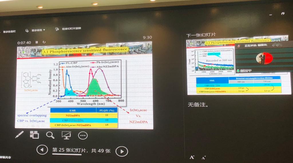 有机光电材料是一类具有光电活性的有机分子材料,广泛应用于各类光电器件,是未来光电行业的主要技术趋势之一。谢国华教授聚焦有机光电材料合成设计、器件制备、性能机理及应用研究方面,介绍了具有热活化延迟荧光(TADF)特性的高分子发光材料的发光本质、基于有机磷光分子敏化荧光材料的电致发光器件的有效制备方法、基于转移打印技术的最先进的多层聚合物发光器件。随后谢教授以印刷电子技术为突破口,基于对OLED的空间相干性和可调谐相干结构的有机电致发光器件等关键科学问题的探索,对“有机光电材料和器件交叉学科研究”做出的原创性成果进行了阐明。