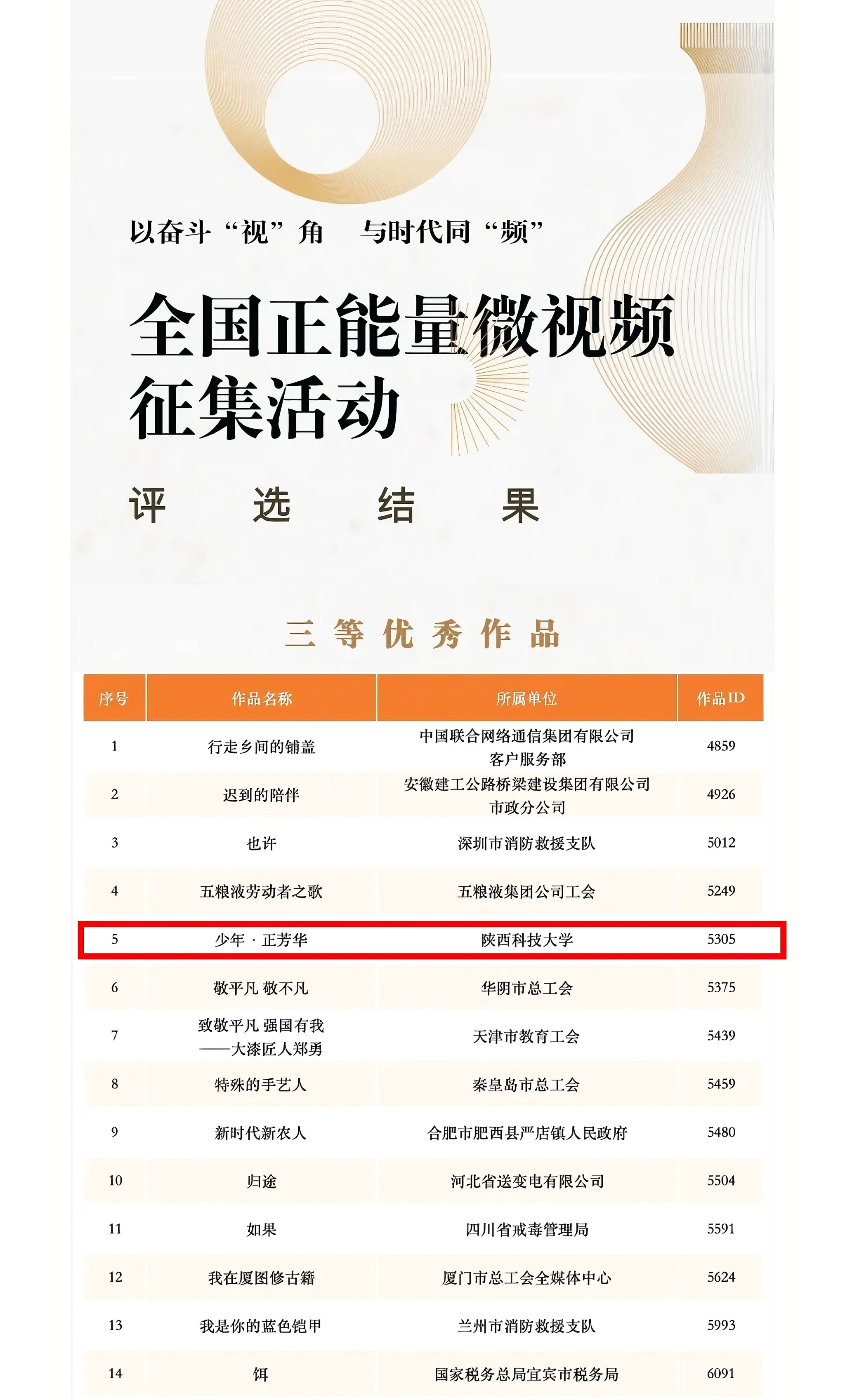 近日,由中华全国总工会和中央网信办主办的2024年“网聚职工正能量,争做中国好网民”全国正能量微视频征集活动评选结果公示,金沙官网微视频作品《少年·正芳华》荣获“全国三等优秀作品”,为我省高校唯一获评作品,实现最好成绩的突破。