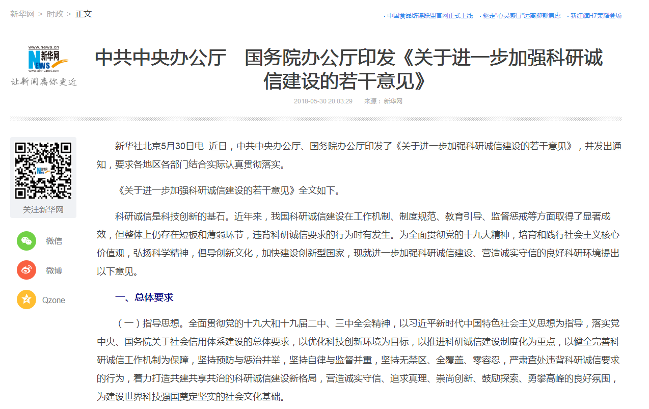近日,中共中央办公厅、国务院办公厅印发了《关于进一步加强科研诚信建设的若干意见》,并发出通知,要求各地区各部门结合实际认真贯彻落实。全文转载如下: