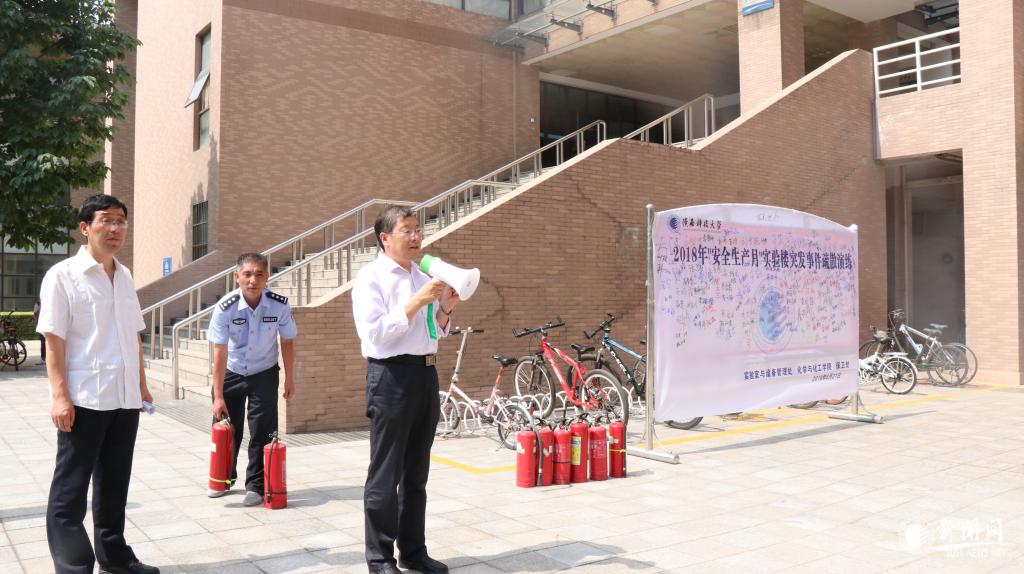 为提高金沙官网师生实验室消防安全意识和自救逃生能力,6月21日上午,由实验室与设备管理处、化学与化工学院、保卫处联合组织的2018年“安全生产月”实验楼突发事件疏散演练在实验楼1A举办。校长助理郑恩让、实验设备管理处副处长张海宁、保卫处处长助理杨军、化工学院全体班子成员及100余名师生参与了本次疏散演练。本次演练疏散方案周详,组织严密,对安全员和师生动员培训扎实有效。