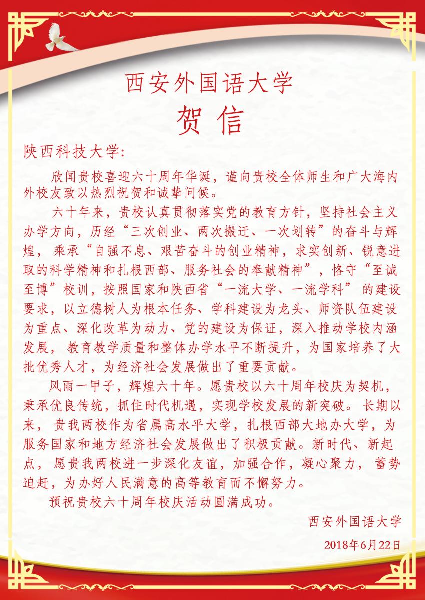 【甲子校庆】西安外国语大学贺信