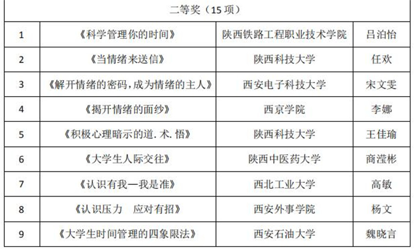 9月7日,陕西普通高校心理健康培训与研修基地公示了2018年陕西普通高校心理健康教育课优秀教案评选结果,金沙官网推选的4件心理健康教育课程教案全部斩获佳绩,获得一等奖2项(全省10项)、二等奖2项(全省15项)。