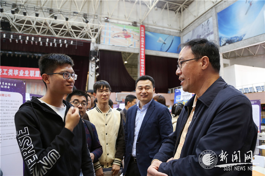 陕西省教育厅学生处正处级调研员胡伟安等一行三人,金沙官网党委副书记温锋、学生就业指导中心主任李晓、各学院学生工作负责人到招聘会现场了解情况,并与用人单位代表、毕业生交流就业情况,听取他们的意见建议。