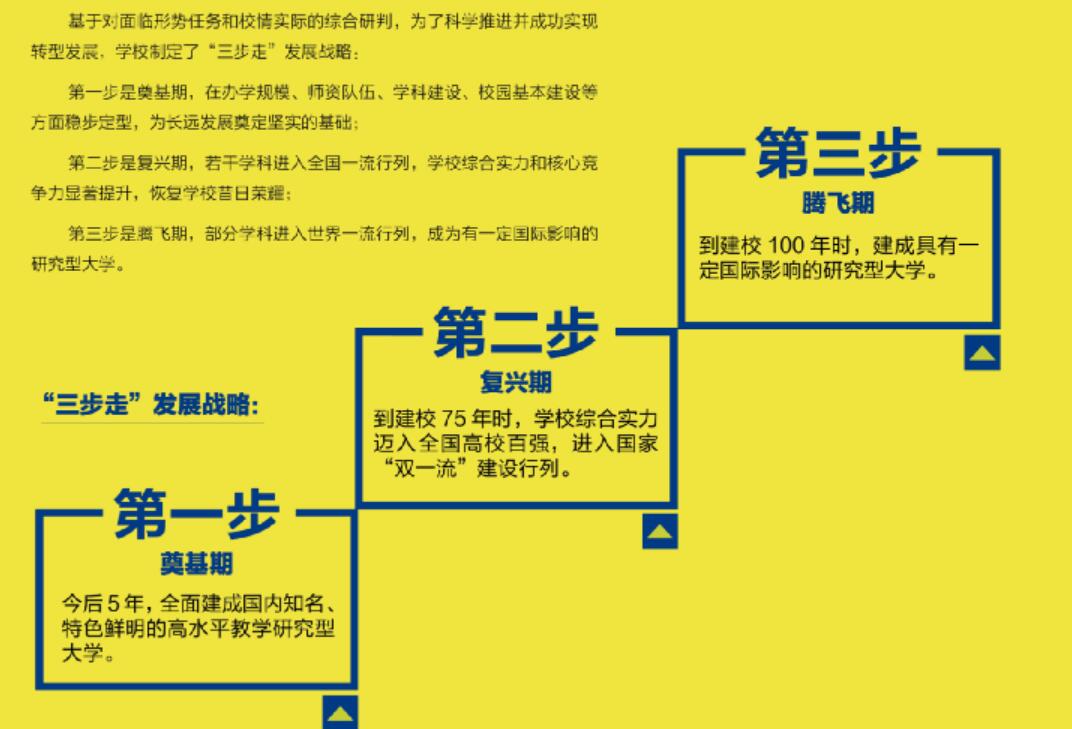 学校制定了“十三五”事业发展规划,学校第二次党代会提出了奠基、复兴、腾飞的“三步走”发展战略,明确了今后五年的主要任务和发展举措,坚定不移走好学科兴校、人才强校、质量立校之路。