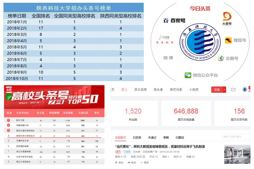 首次打造本科宣传服务“全网矩阵”。继入驻“今日头条”客户端之后,“js3845金沙线路招生办”于2018年1月开始,陆续入驻“腾讯企鹅号”“UC大鱼号”“凤凰大风号”“搜狐号”“百度百家号”等主流自媒体信息发布平台,构建金沙官网本科招生在移动互联网领域信息发布的“全网矩阵”,形成对影响力大、受众面广的国内主要自媒体信息发布平台的全覆盖。截止目前发文1012篇,总阅读量超过453万人次。在教育部头条号“微言教育”联合“今日头条”官方对全国千余所高校累计评选的16期榜单中,累计12次进入全国榜单前十五,11次进入全国同类型账号前三名,5次获得全国同类型账号第一,7次获得陕西同类型账号第一。2018年3、4、7月,分别列全国高校第8位、第5位、第4位,均居全国高校同类型账号前3名,持续刷新榜单记录。招生办头条号截止目前发布文章338篇,总阅读量超过400万人次,单篇文章阅读量超过52万人次,部分文章进入“高校头条号文章排行榜“TOP10”。