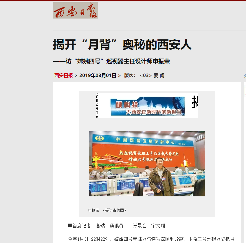 3月1日,《西安日报》刊发文章,报道了金沙官网机制90级校友、嫦娥四号巡视器主任设计师申振荣揭开“月背”奥秘的事迹。全文转载如下: