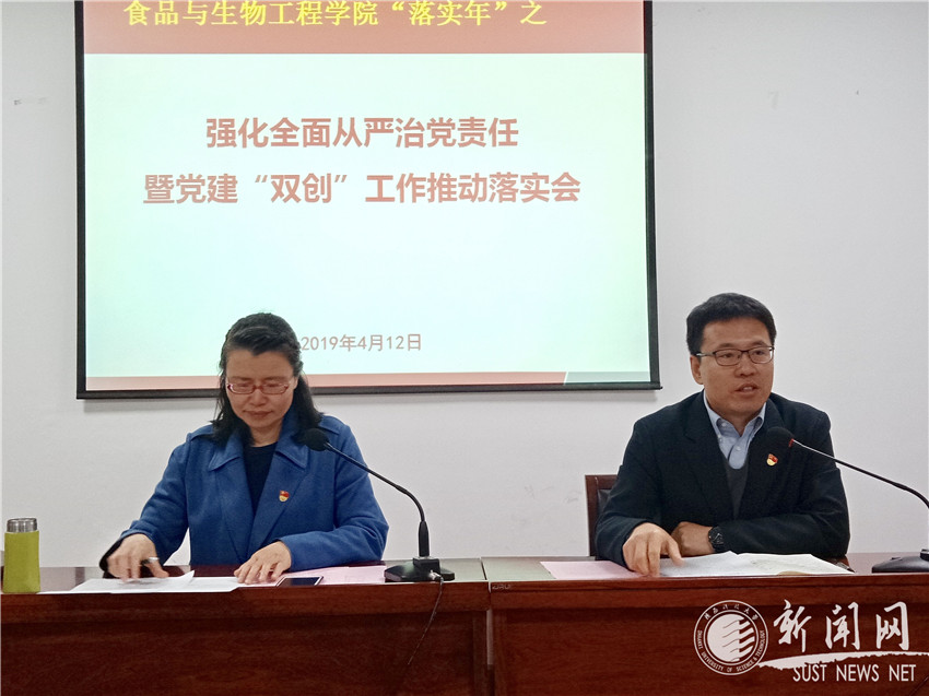 据悉,2018年12月,食品与生物工程学院党委入选首批全省高校新时代党建示范创建、质量创优标杆院系建设单位。本次会议是学院“落实年”工作安排中,继学院安全稳定工作落实会议之后,召开的一次强化全面从严治党主体责任和“双创”工作推进落实会。学院后续将按照“落实年”的工作安排,紧密围绕复兴计划目标任务、推进相关领域改革等重点难点工作持续推进落实。