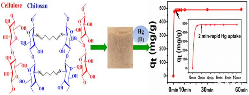 壳聚糖-纤维素复合泡沫对溶液中Hg(II)的吸附示意图