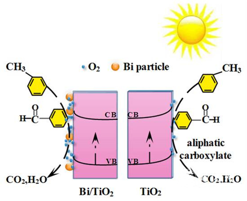 在Bi修饰TiO2和纯TiO2表面上,甲苯降解可能的微观过程