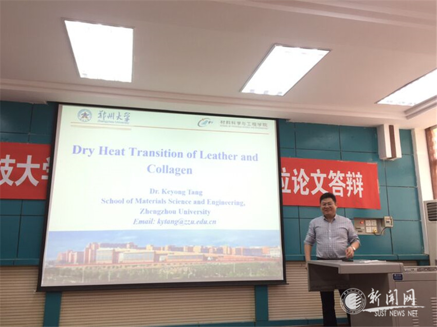 5月20日下午,应研究生院和轻工科学与工程学院邀请,郑州大学材料科学与工程学院副院长汤克勇教授作客金沙官网“未央导师论坛”,在轻工学院学术报告厅为学院师生作了一场题为《Dry Heat Transition of Leather and Collagen》的学术报告。报告会由轻工学院副院长吕斌致欢迎辞并主持,学院部分教师和博士硕士研究生参加了此次报告会。
