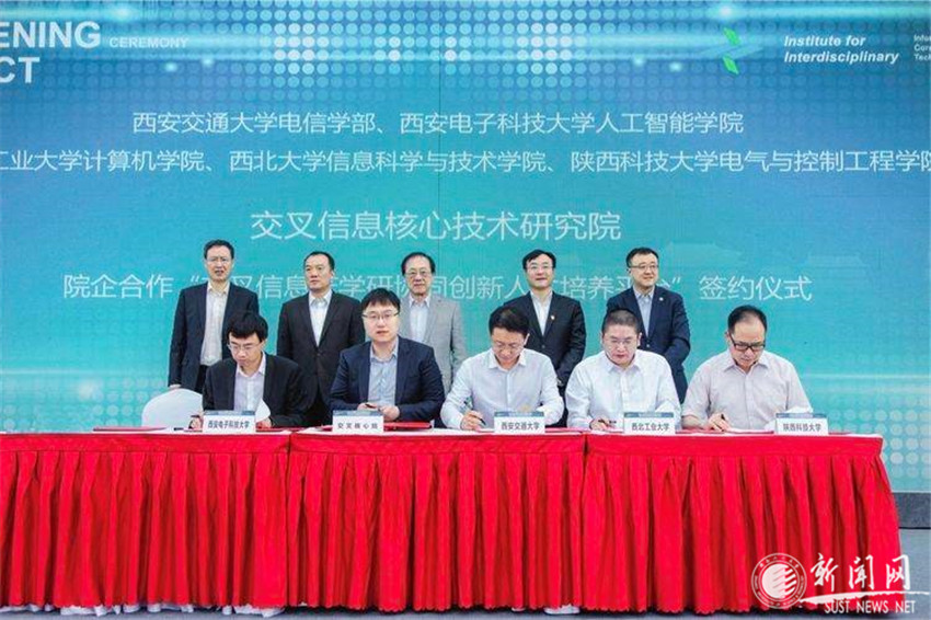 投运庆典仪式上,在姚期智、钟洪江、王勇、杨斌、李志军的共同见证下,交叉核心院与js3845金沙线路电气与控制工程学院、西安交通大学电信学部、西安电子科技大学人工智能学院、西北工业大学计算机学院、西北大学信息科学与技术学院等5所培养单位以及中国银行业协会、德邦证券股份有限公司、西安深信科创信息技术有限公司、新石器交叉信息核心技术研究院(西安)等4家企业签约,合作建立“交叉信息产学研协同创新人才培养平台”。汤伟代表金沙官网电控学院上台签约并领牌。