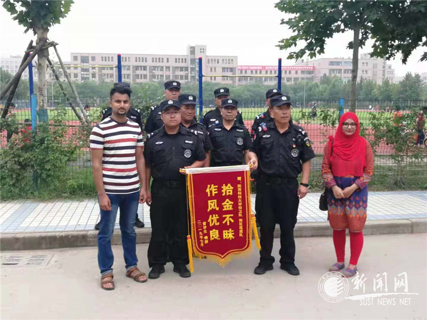 7月11日下午,校卫队交接班时,出现了感人的一幕:两名留学生将一面上书“拾金不昧,作风优良”八个大字的锦旗,亲手交到校卫队班长张战胜手中,并不住地说“谢谢”。张战胜不好意思地连连摆手,“没啥,我们经常这样做”。