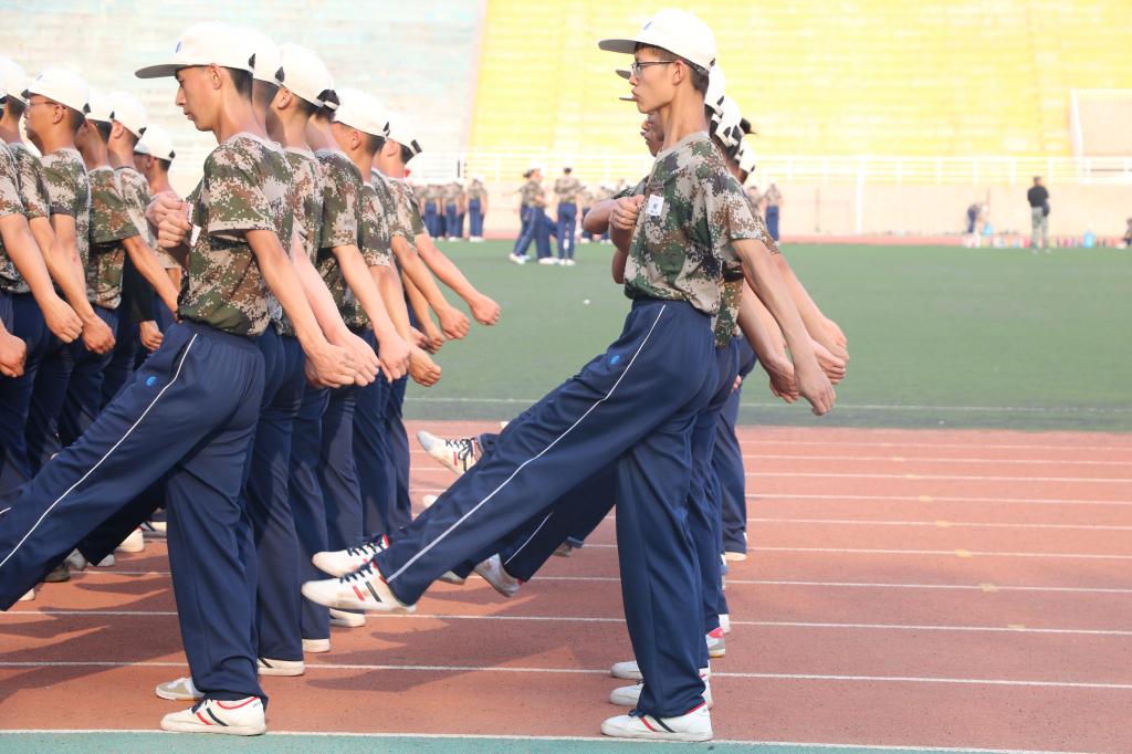9月3日,随着一声声响亮的口令,学员们的动作整齐划一。站军姿,踢正步,调整手臂和抬腿的高度,每一个动作都力求做到极致与完美,这些稚气未脱的“零零后”们都在用不服输的倔强证明自己。高温的天气,他们依然坚持着,呐喊着,汗水划过他们稚嫩的脸庞,但他们并没有停下自己向前迈进的脚步。